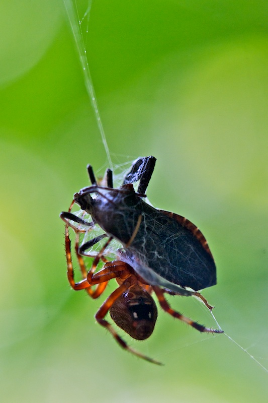 I haven't had a chance in awhile to go out and shoot photos, but luckily you don't always need to leave home to find good subjects to shoot. Peering outside the window this morning, I saw a spider snagging a meal. I swapped the macro lens onto my camera and took a few shots.