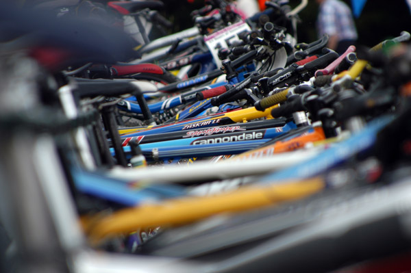 A sea of mountain bikes at the base area waits patiently for their riders to take another lap. The course is a few miles in length and covers some very technical terrain: steep climbs (and descents), singletrack, fire roads, and a fair share of roots and other obstacles. And, nearly every year, mud is a major factor. During 2003's race, the organizers made a last minute decision to reduce the size of the course to eliminate a loop that was deemed too muddy. After a few hours, sections of the course became quite gloppy.