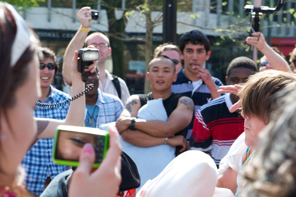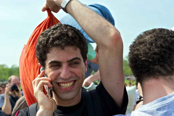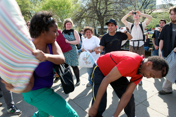 Saturday, April 3, 2010 was a day of Apples and Pillows. At 9 a.m., Apple began selling the iPad, and I found myself waiting in line patiently to purchase my own multitouch slice of the future. Then, I hopped on Amtrak and headed to D.C. to photograph International Pillow Fight Day. I covered this event last year, and this year was just as fun, bringing together hundreds of strangers for a good old-fashioned pillow bashing, set against the backdrop of our nation's Capital on a beautiful spring day.The first round of the pillow fight broke out near the Washington Monument. Then, we migrated over to Dupont Circle for more pillow fights and games such as "capture the flag."